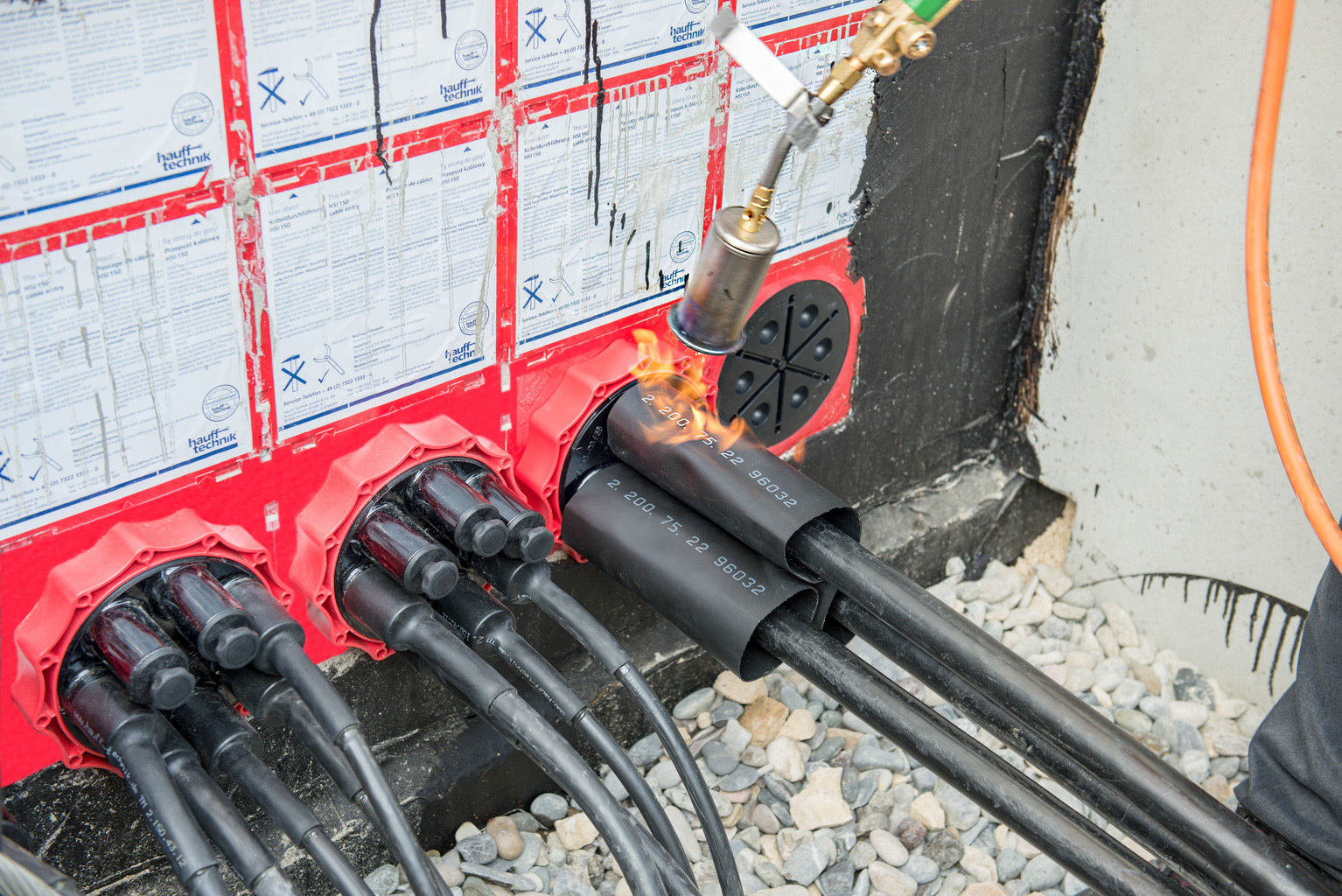 13. Chauffer les manchons thermo-rétractables en commançant par les côté couvercle